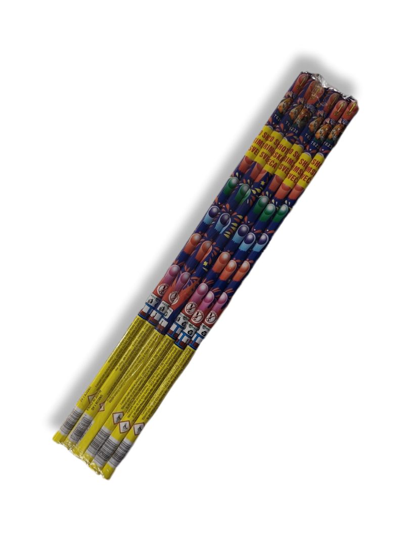 NAPOMENA: Proizvodi su fiksirani vertikalno na cev, šipku ili drugi sličan predmet čvrsto zaglavljen u zemlju. Upalite osigurač i udaljite se najmanje 5 m. Osigurajte slobodan prostor iznad proizvoda. Ne koristite u blizini zapaljivih predmeta. Zabranjeno je držati proizvode u ruci, kao i koristiti ih u zatvorenim prostorijama. Zabranjena je upotreba osobama mlađim od 18 godina. Ako se proizvod ne zapali, sačekajte najmanje 5 minuta i prelijte vodom. Nepravilna upotreba može dovesti do povreda i požara. SAMO ZA SPOLJNU UPOTREBU!